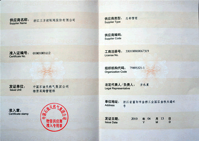 浙江J9.COM集团有限公司下属公司浙江J9.COM控制阀股份有限公司于2010年4月正式通过中国石油天然气集团公司审核取得调节阀产品一级供应商证书。